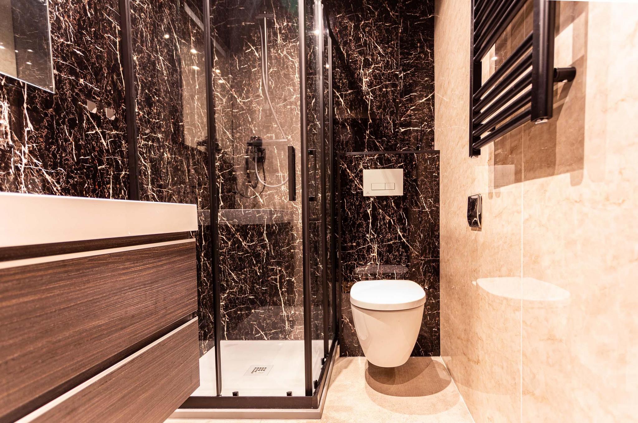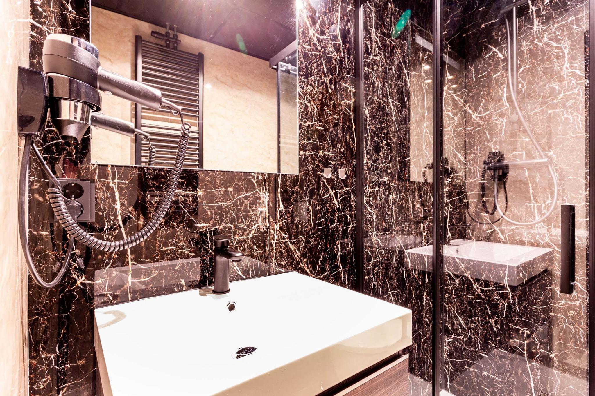 - Badkamer met douche, wastafel en toilet