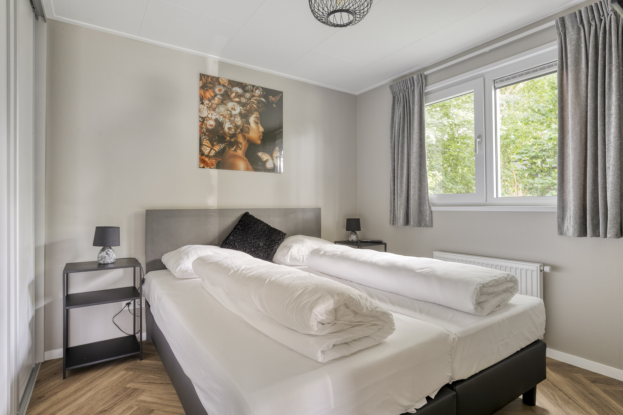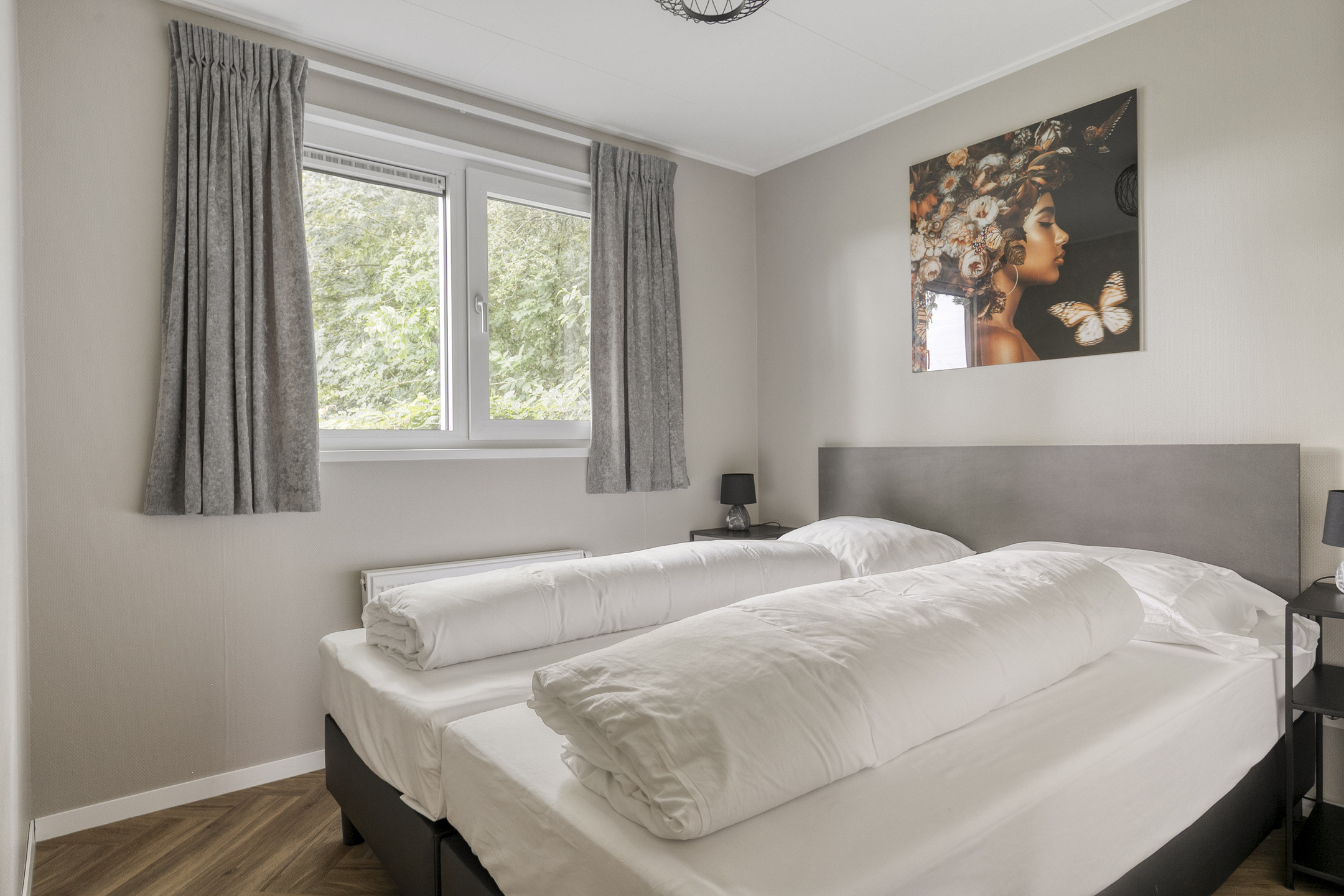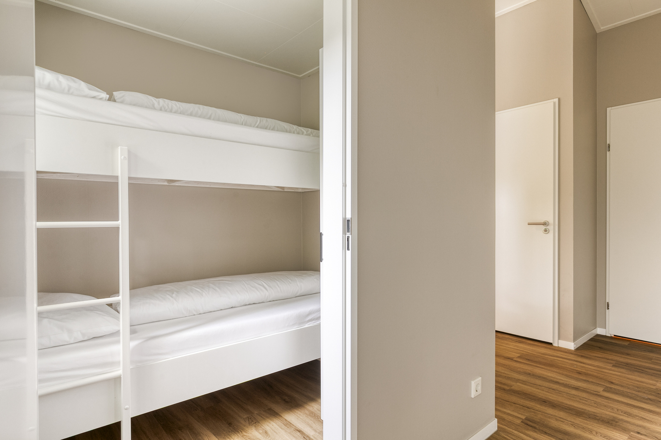 - Slaapkamers: 3 in totaal, met 4 eenpersoons boxspringbedden en 1 stapelbed. Bedden zijn opgemaakt bij aankomst