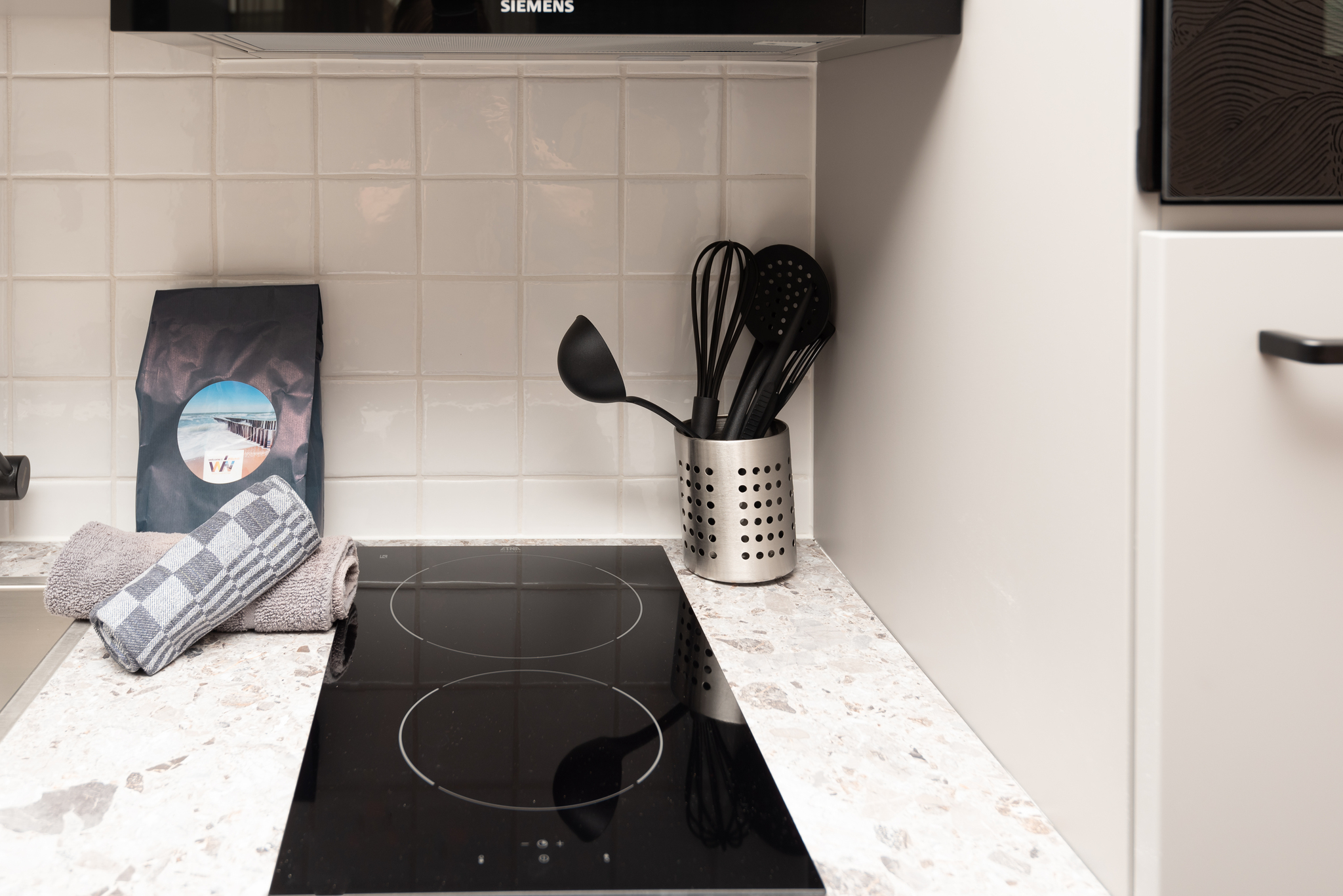 De keuken heeft een combi-magnetron, een vaatwasser, een koelkast met vriesvakje, een koffiezetapparaat en een waterkoker.