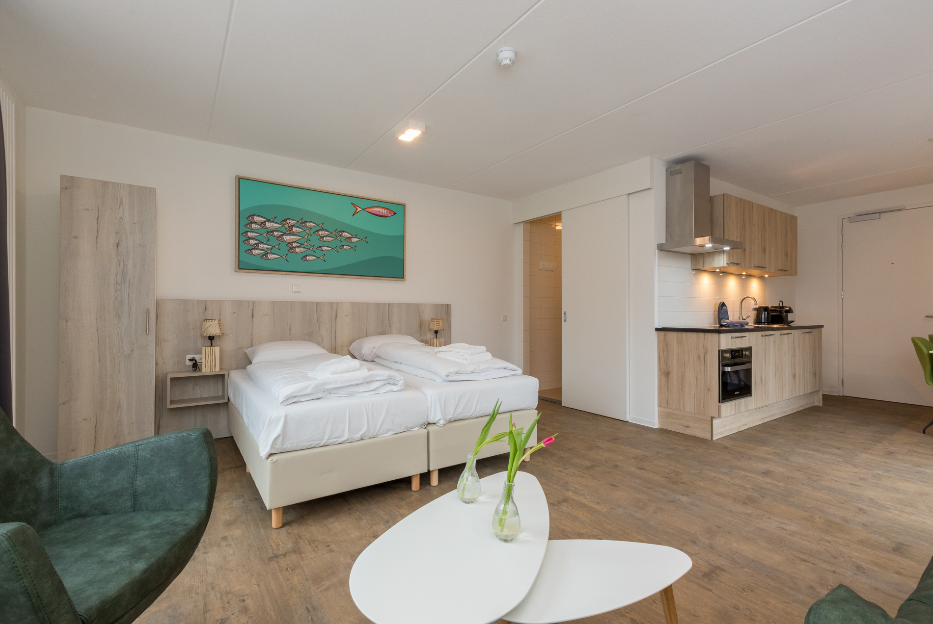 Geniet van je vakantie in luxe en comfort. Deze premium studio's combineren het gemak van een studio met het comfort van een hotelkamer. Ontspan na een lange dag in een comfortabel tweepersoons boxspringbed. Elke studio beschikt over een ruime zit- en eethoek en een volledig uitgeruste keuken met een koelkast, waterkoker, vaatwasser, oven, filterkoffiezetapparaat en een Nespresso-machine.