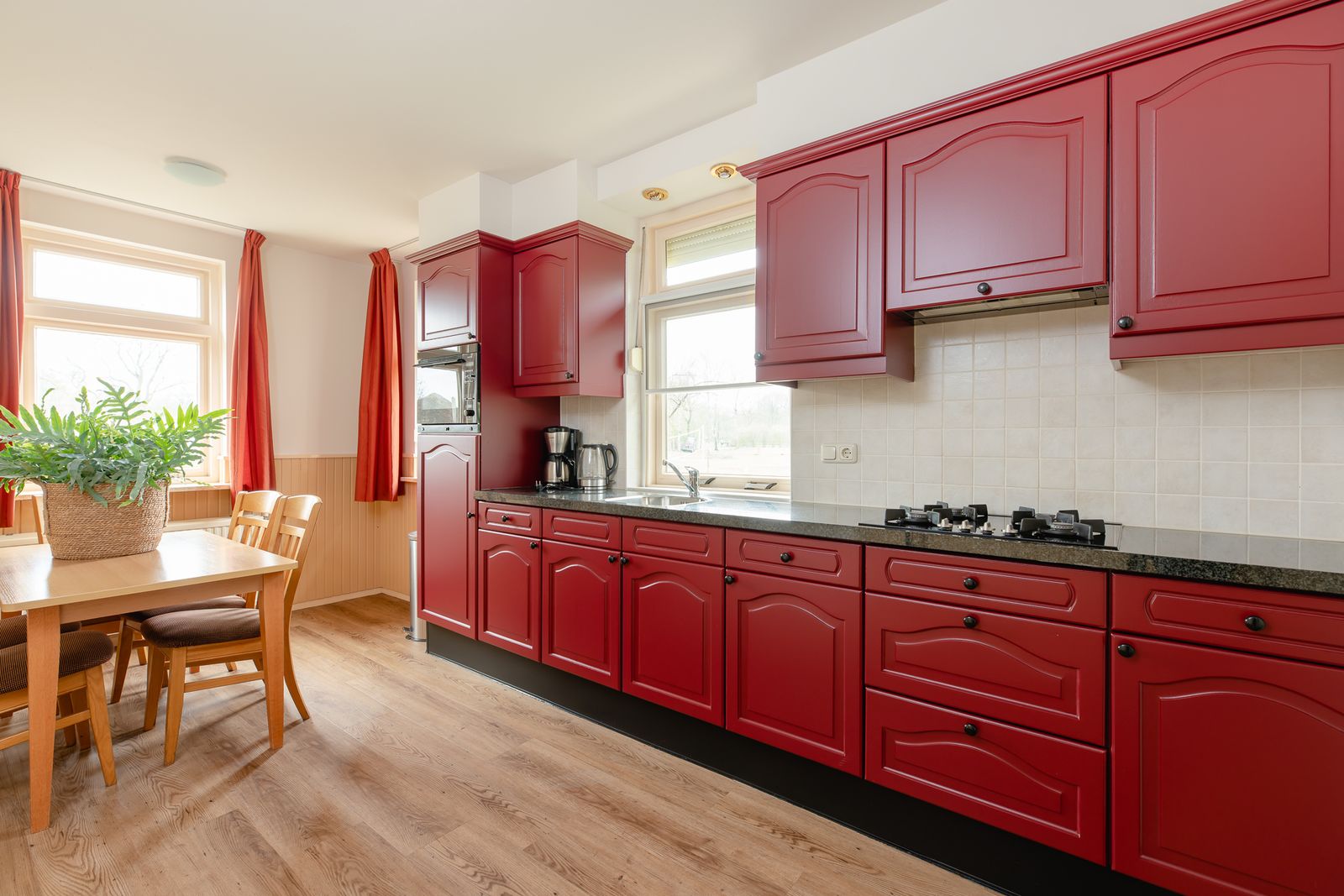 Keuken: vaatwasser, combimagnetron, koffiefilterapparaat (maat 4), kookfaciliteiten, volledige keukeninventaris en koel-/vriescombinatie (keukenlinnen kan worden bijgeboekt).