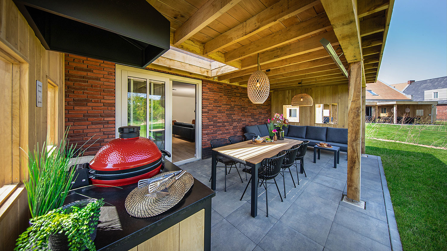Deze vrijstaande vakantievilla van circa 150 m2 heeft een heerlijke tuin, een extra groot overdekt terras met o.a. een comfortabele lounge-set en een BBQ-meubel. Daarnaast heeft het terras standaard twee zijwanden die voorzien zijn van een open venster.