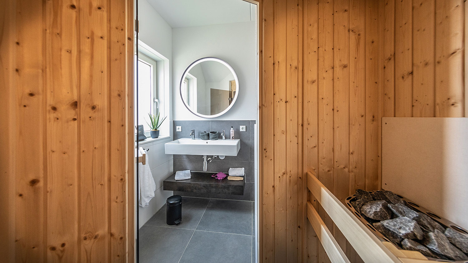 De villa heeft vier slaapkamers, waarvan één op de begane grond. De slaapkamer op de begane grond is voorzien van twee eenpersoons box springbedden en een en-suite badkamer met wastafel en inloopdouche. De eerste verdieping heeft drie slaapkamers en twee badkamers, waarvan één en suite met een wastafel en een inloopdouche. De slaapkamers hebben elk twee eenpersoons box springs. De andere twee slaapkamers beschikken over twee eenpersoons box springs. De tweede badkamer op de eerste verdieping is voorzien van een sauna met wastafel en inloopdouche.