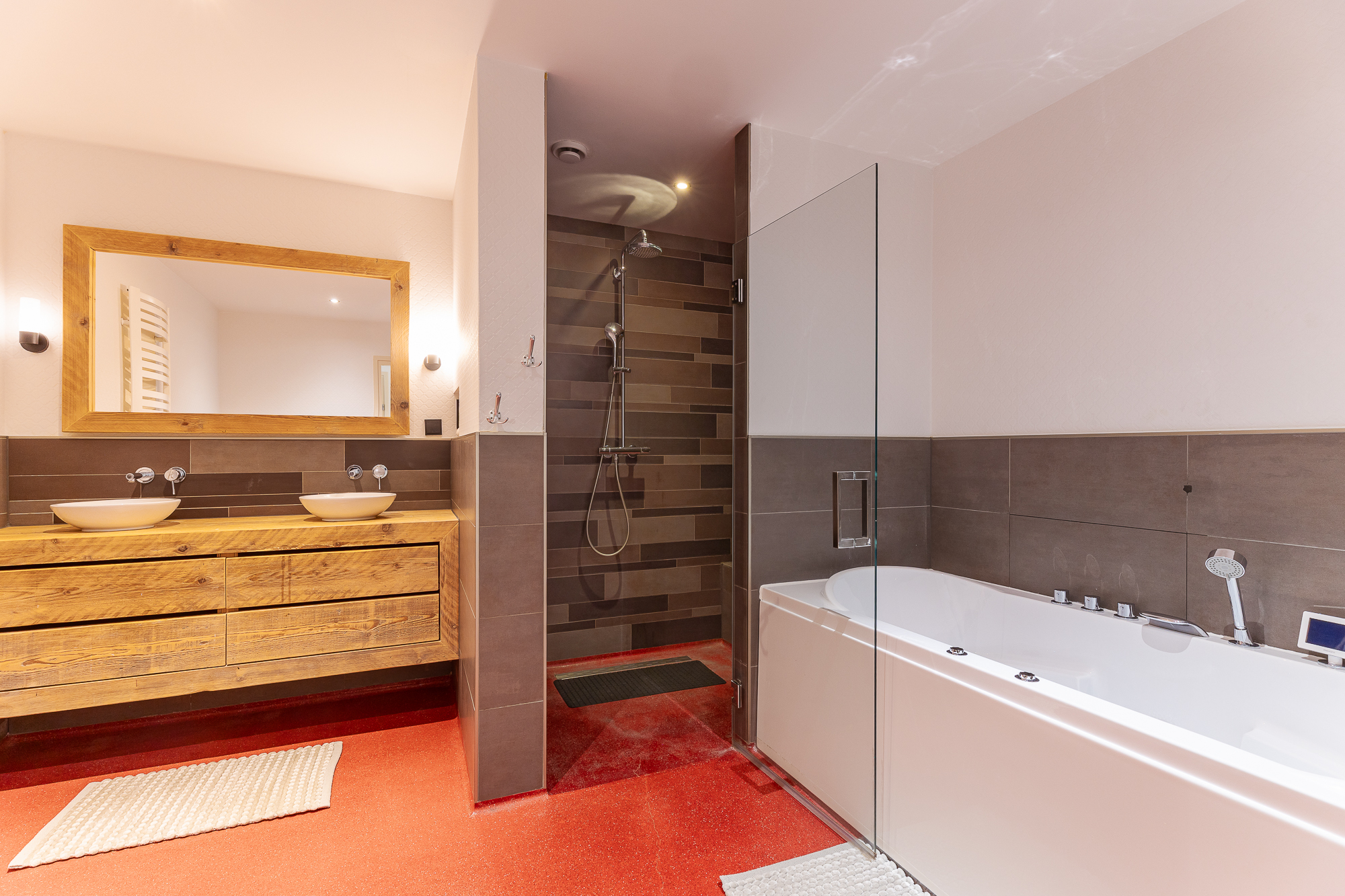 De vier slaapkamers zijn allemaal voorzien van airconditioning en comfortabele boxspringbedden. Eén slaapkamer heeft een eigen badkamer met douche en wastafel, terwijl de tweede badkamer beschikt over een douche, dubbele wastafels en een luxe bubbelbad. Een apart gastentoilet biedt extra gemak voor grotere groepen.