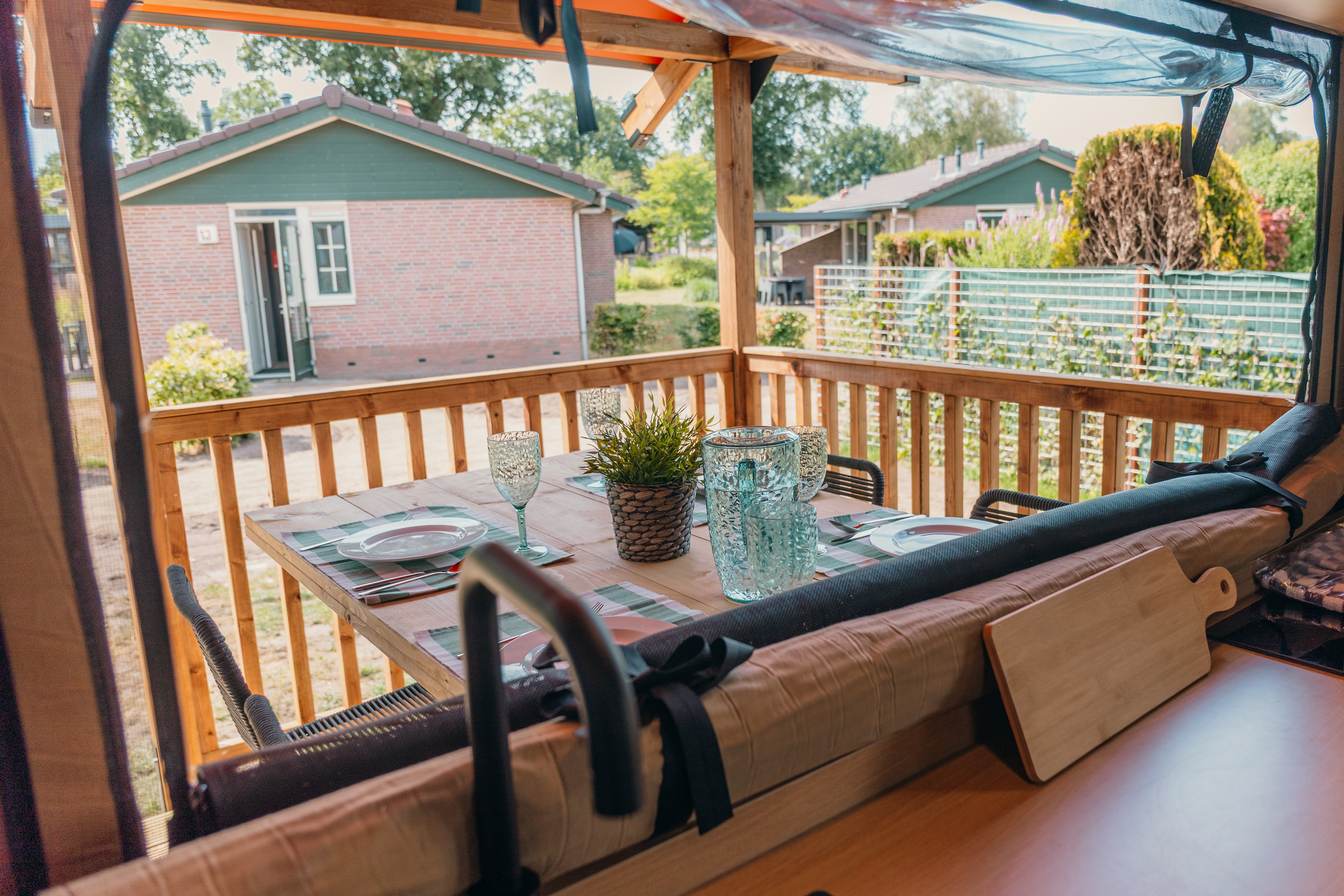 De lodge beschikt over een ruime binnentent van 6 x 4,5 meter en een extra loft van 7 m² – ideaal als slaap- of speelruimte voor kinderen. Deze accommodatie combineert de charme van kamperen met het gemak van een vakantiehuis.