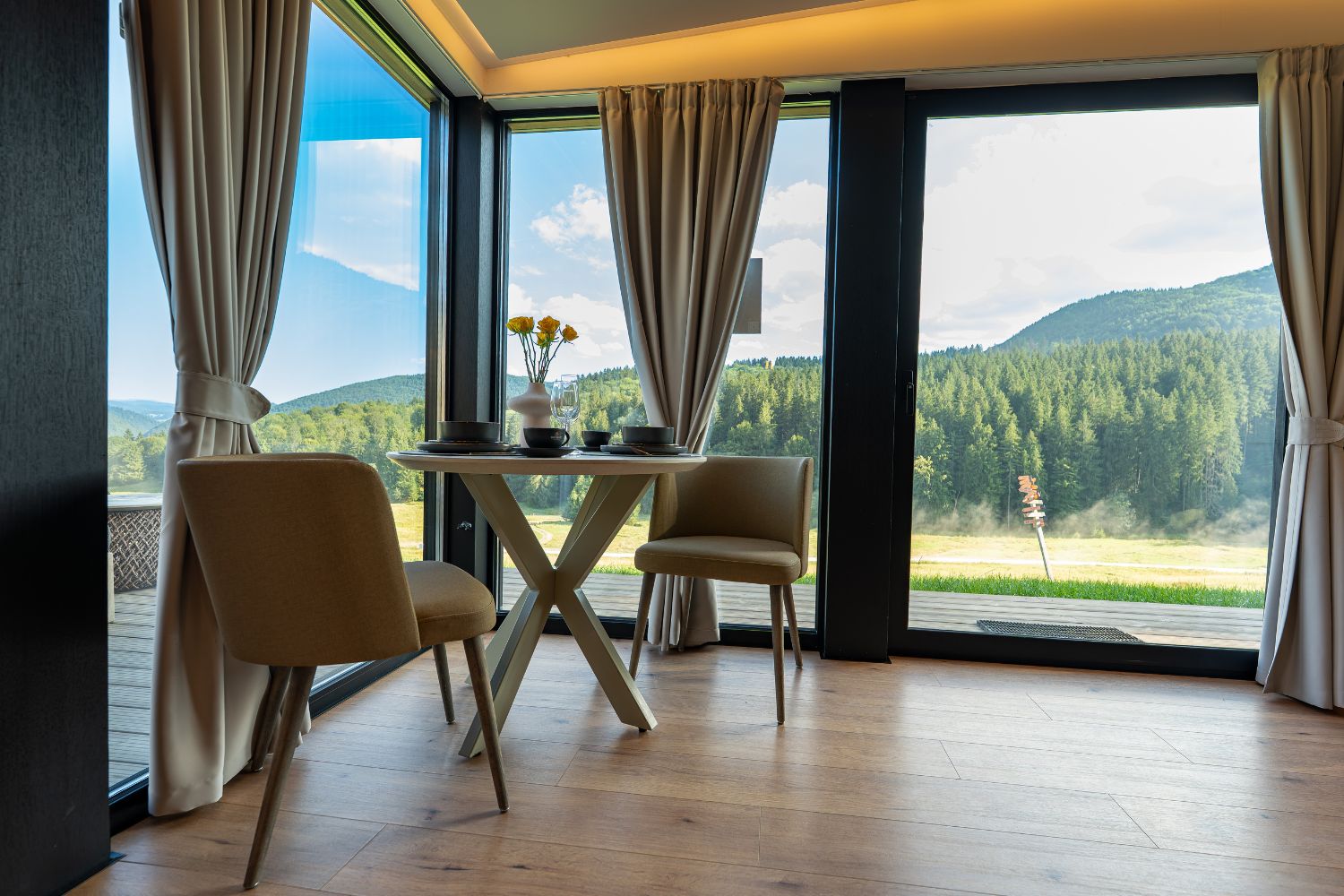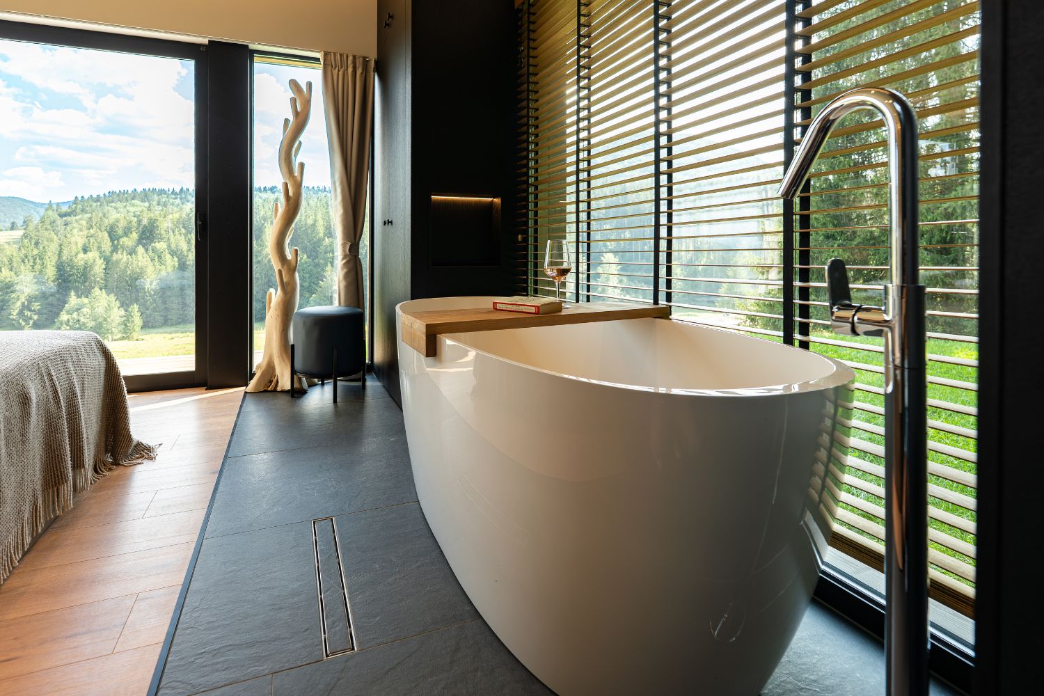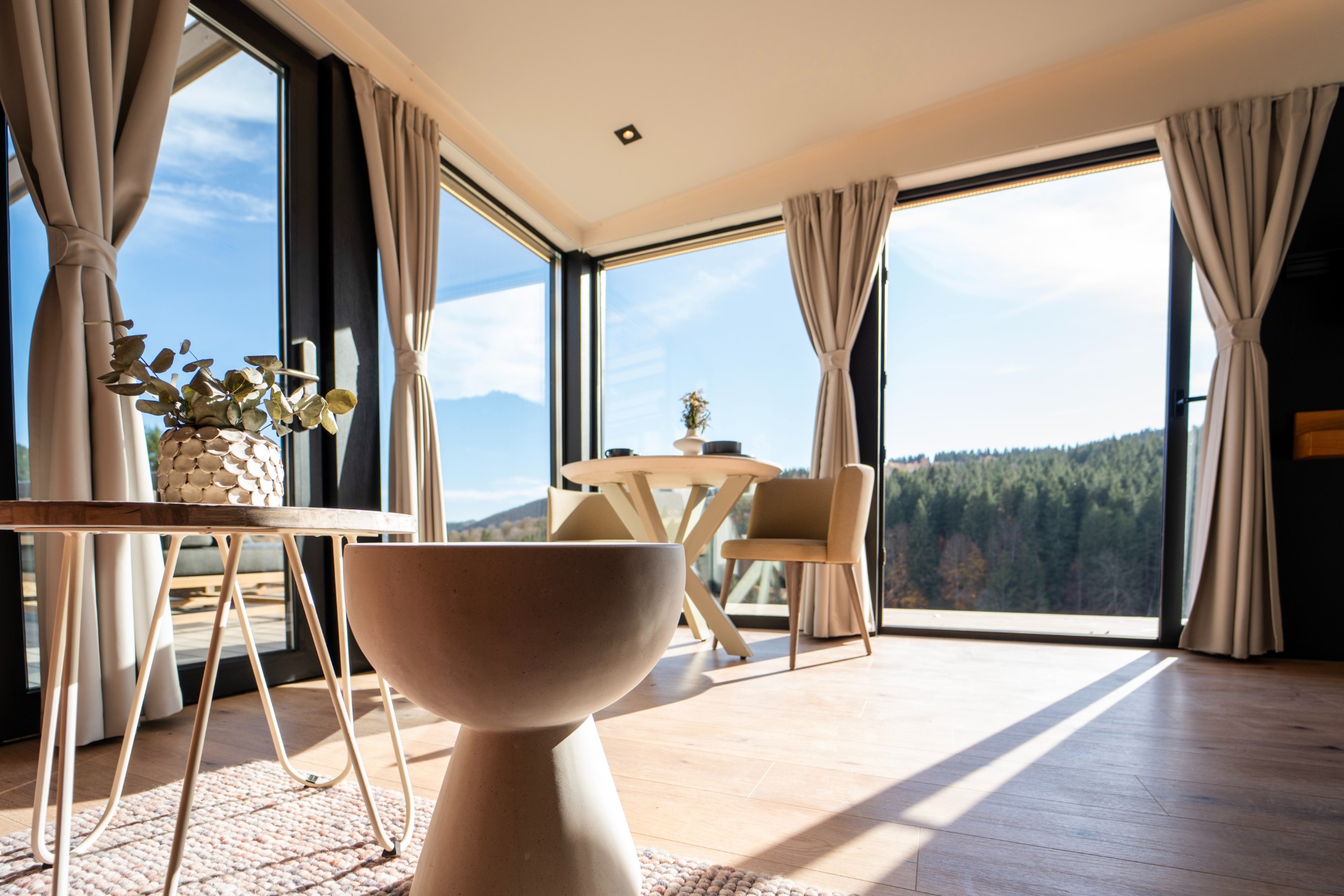 De slaapkamer biedt een panoramisch uitzicht op de bergen en is voorzien van een tweepersoonsbed, twee nachtkastjes, zacht gloeiende verlichting en een vrijstaand bad voor intieme ontspanning.
