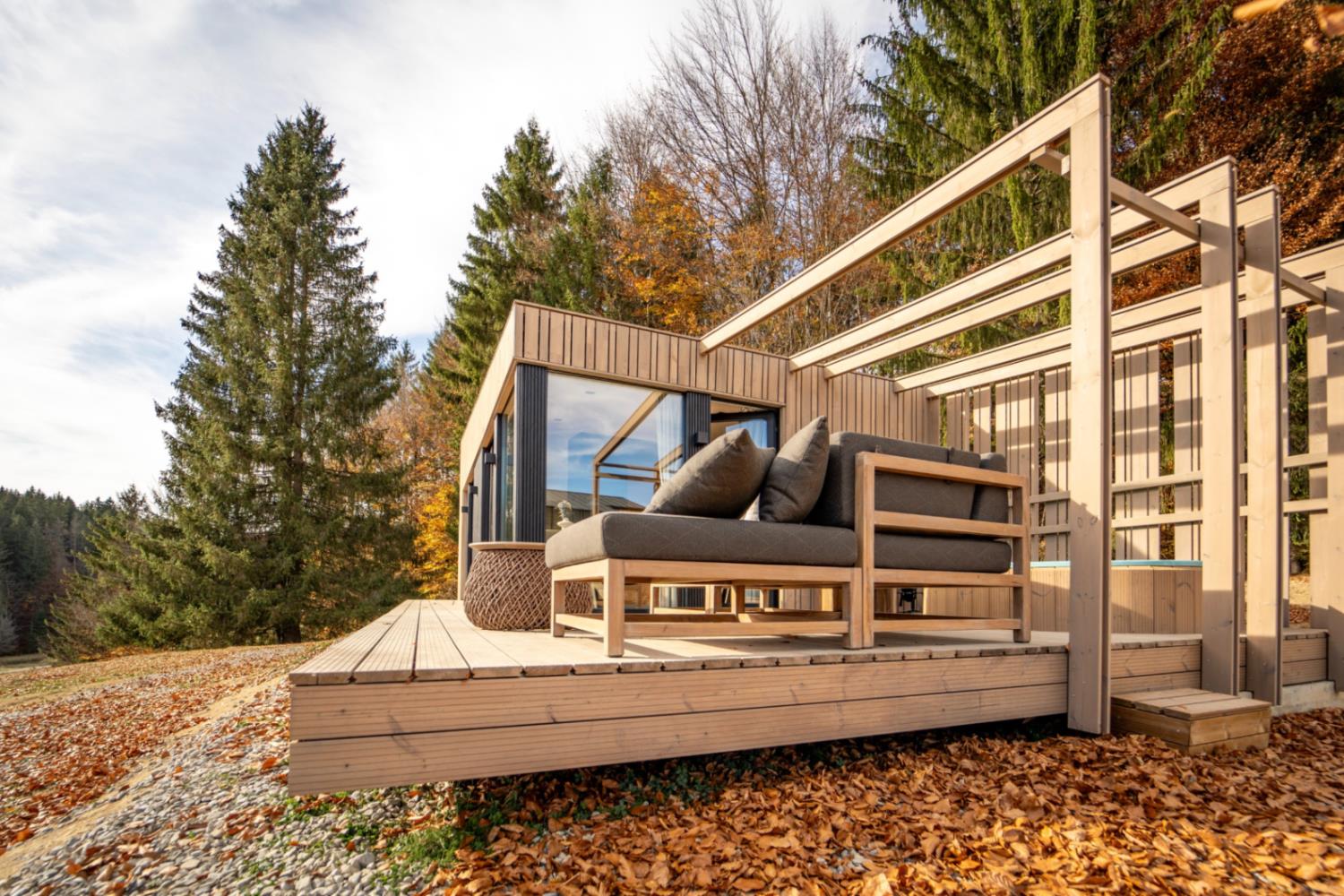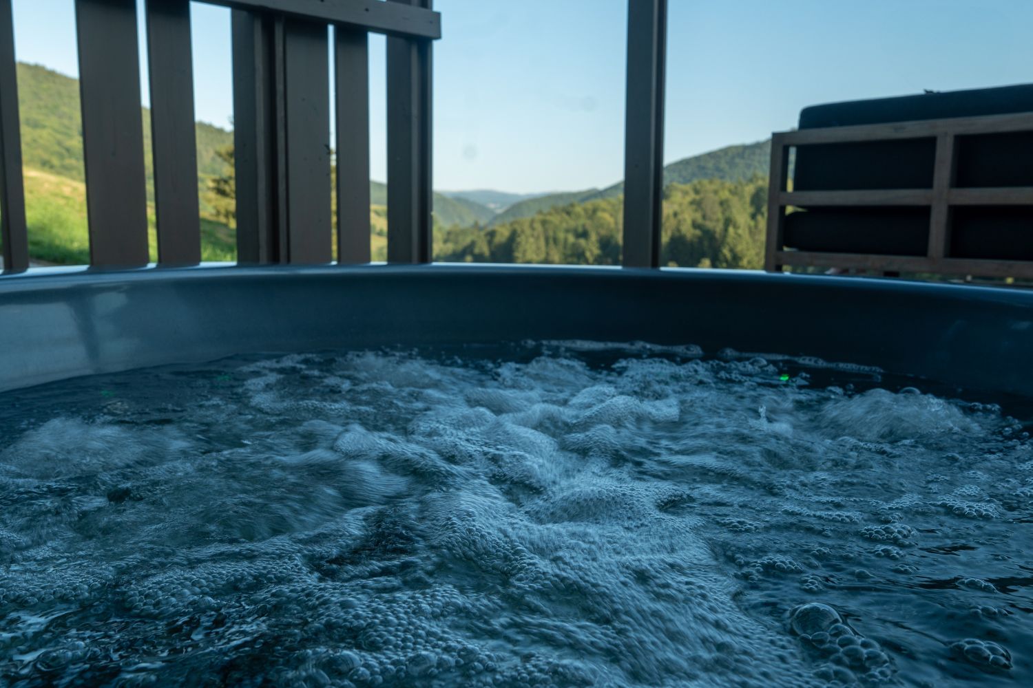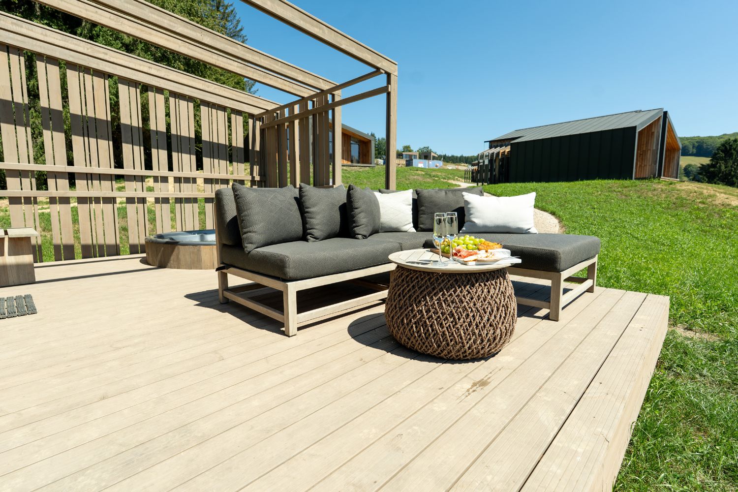 Het panoramische terras van 25 m² is volledig gemeubileerd en beschikt over een pergola en een privé hot tub.